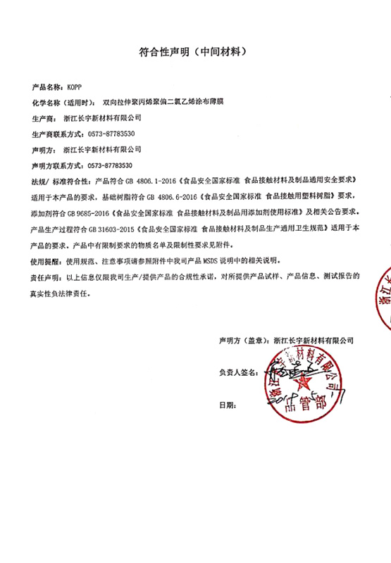 Changyu ist der Pionier und Befürworter des "transparenten Aluminiumoxidfilms für Verpackungen" auf dem chinesischen Markt. Wir haben unablässige Anstrengungen für die Entwicklung und Förderung dieses Produkts unternommen. Changyu ist auch der Konstruktion von laufenden wichtigen nationalen Standardprojekten "Qualitätsregeln für Oxids -Barrierer transparentes Plastiklaminierte Filme und Poppes für Lebensmittelverpackungen".